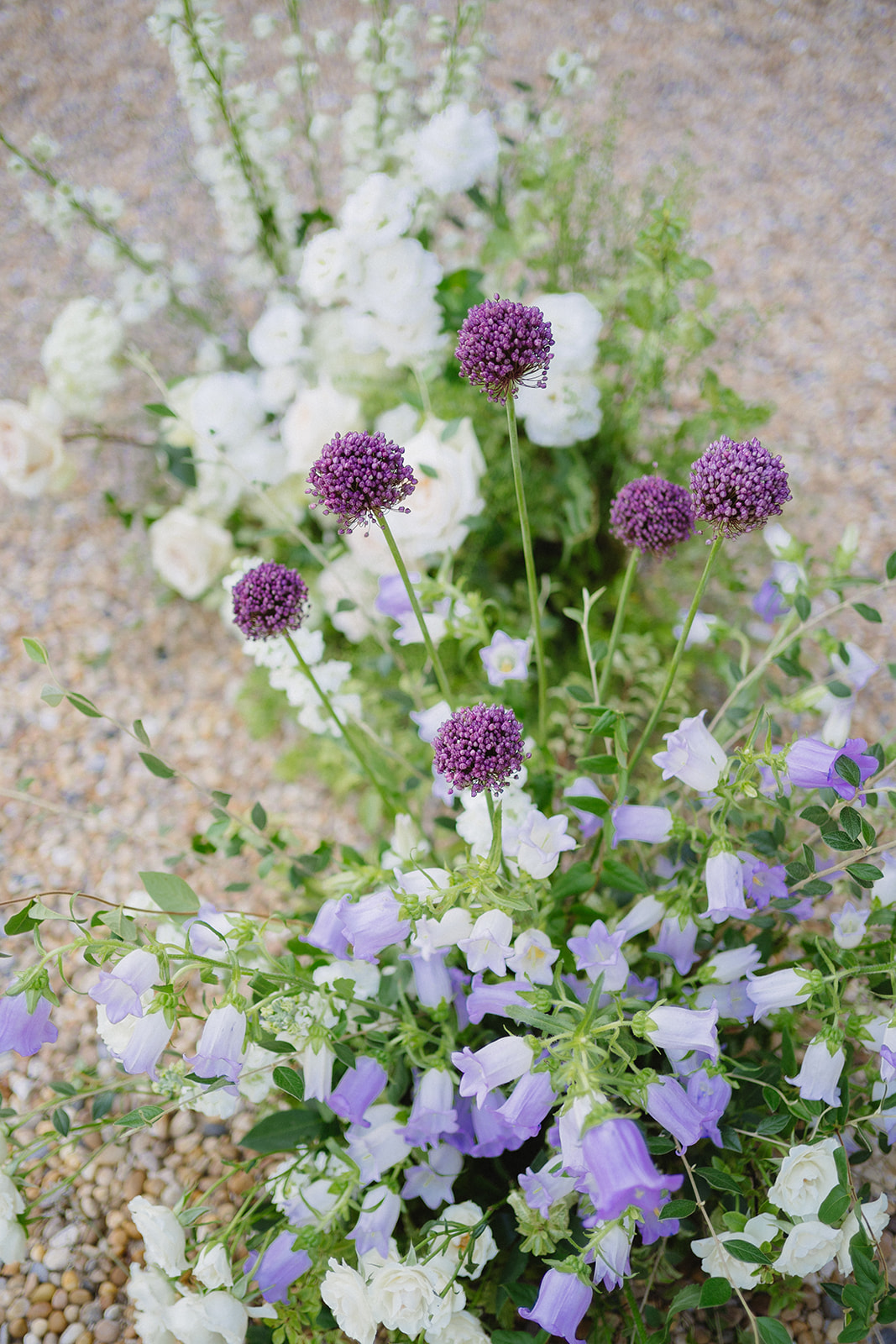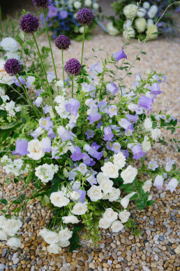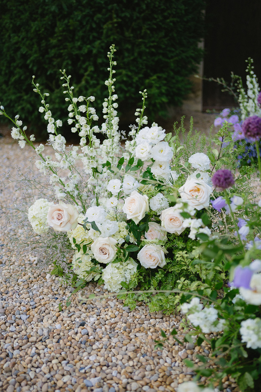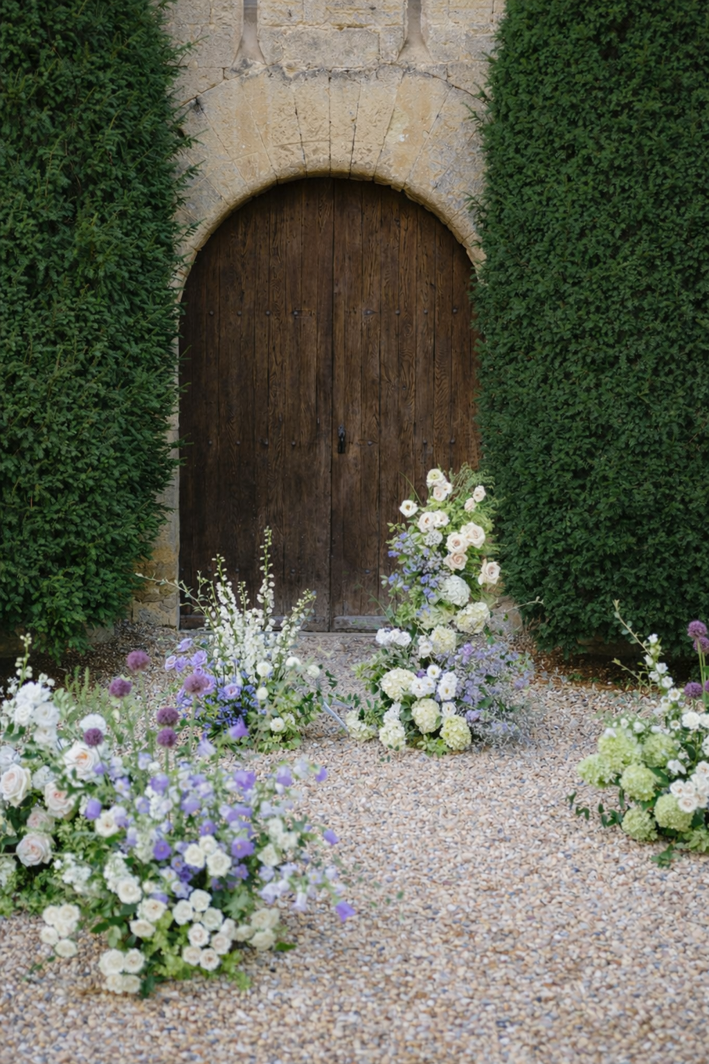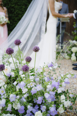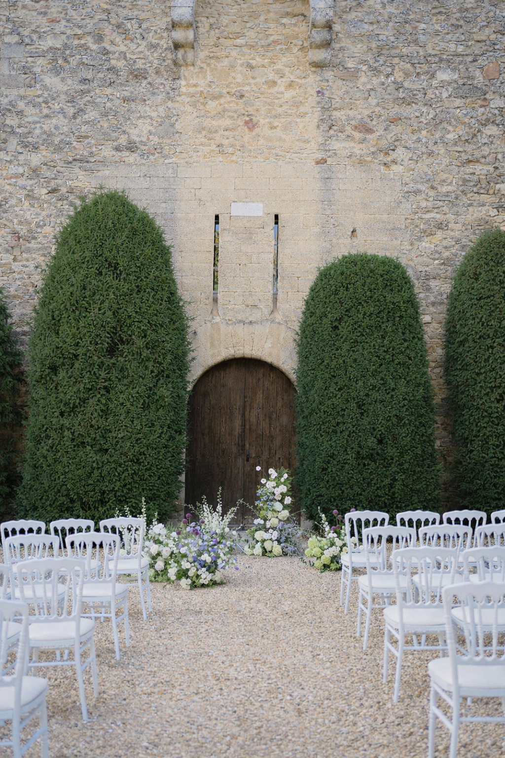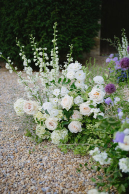La cérémonie se tient à l’entrée du château, où un décor inattendu prend vie autour des mariés. Un backdrop romantique avec des fleurs délicates, des variétés de jardin arrangées comme si elles poussaient naturellement depuis le sol.